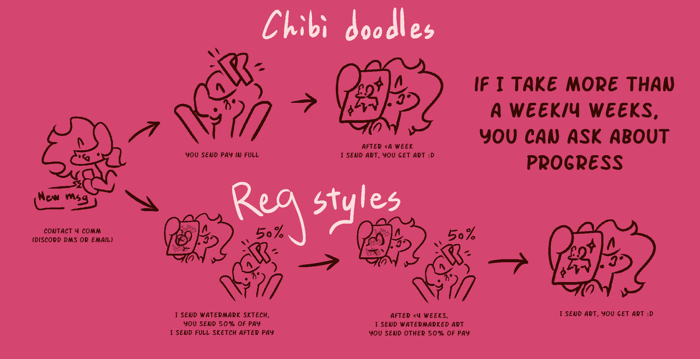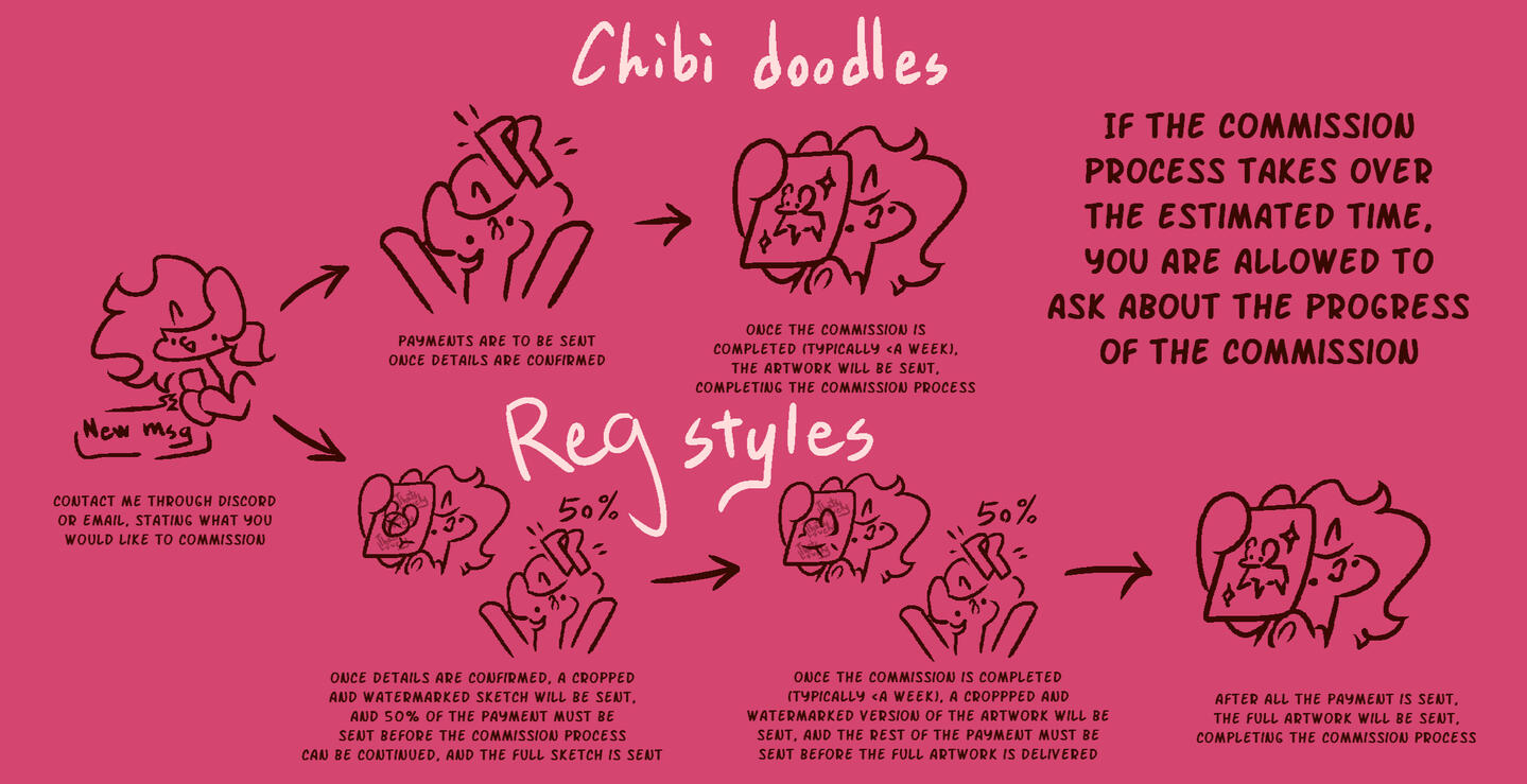 -I will NOT under any circumstances draw NSFW or sexually suggestive content-I only accept payments through paypal-I am allowed to decline commissions if anything makes me uncomfortable-Major changes made after the lining phase (base coloring phase for lineless commissions) will be charged extra (Charges depend on how much is changed)-If used in public spaces, please provide the proper credits for any commission piece made by me, and do not claim the art piece as your own-Your commission may be used as future examples, please tell me if you don't want your commission to be used-All of my commission works are done for personal use only!-The estimated time for the commission may be negotiated-Refunds are allowed if I'm not able to finish the commission, but not under any other circumstance-My prices may change! If prices change during a commission, the original price when the commission is ordered will be the final price